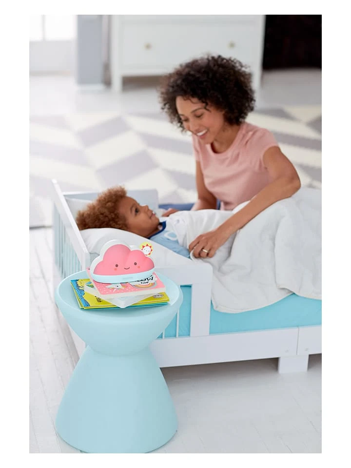 – Schlaftrainer mit kinderfreundlichen Farbanweisungen: Rot = Zeit fürs Bett; Gelb = fast Zeit aufzustehen; Grün = Okay, um aufzustehen