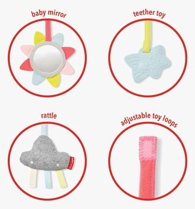 Spieldecke mit Spielbogen von Skip Hop mit einem weichen Spielteppich. Drei hängende Spielzeuge am Spielbogen und ein flauschiges Kissen sind inbegriffen. Die Spieldecke kann zur einfachen Aufbewahrung oder zum Mitnehmen auf Reisen und Ausflügen zusammengefaltet werden. Die Spieldecke und der Spielbogen können separat verwendet werden. Perfekt für das Spielen in Bauchlage.