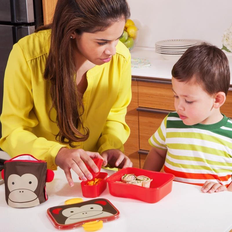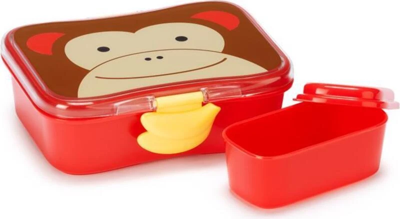 Eine schöne Zehntelschachtel im Skip Hop-Stil, entworfen von der Zoo-Kollektion, besteht aus 2 Teilen: einer Zehntelschachtel mit undurchlässigem Deckel und einer kleineren Schachtel für Biskuitkuchen.