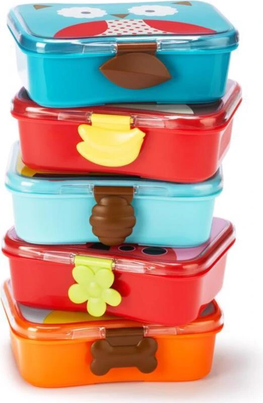 Eine schöne Zehntelschachtel im Skip Hop-Stil, entworfen von der Zoo-Kollektion, besteht aus 2 Teilen: einer Zehntelschachtel mit undurchlässigem Deckel und einer kleineren Schachtel für Biskuitkuchen.