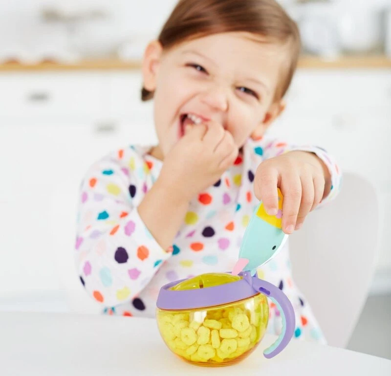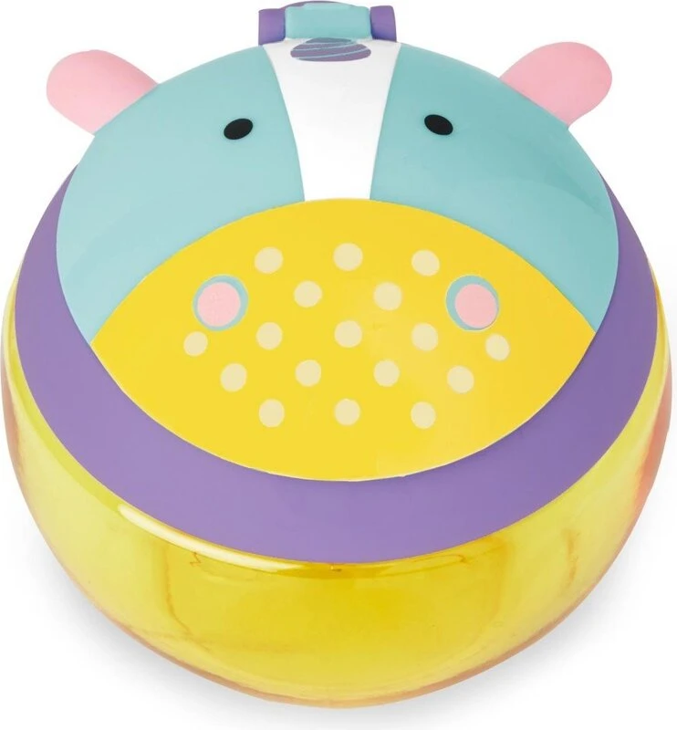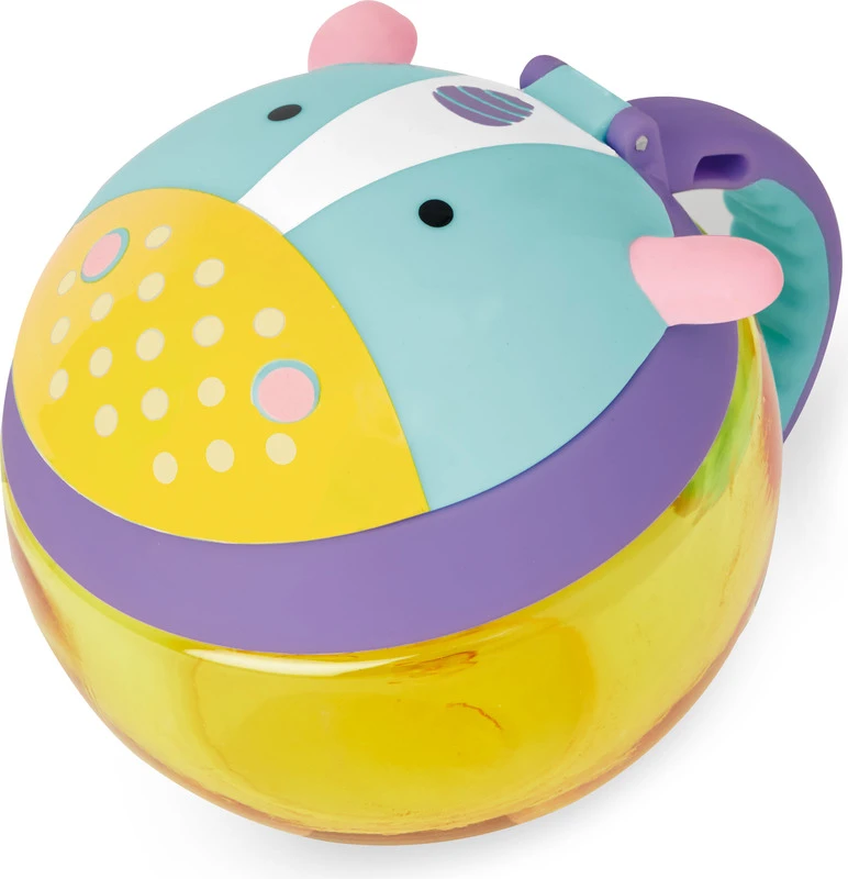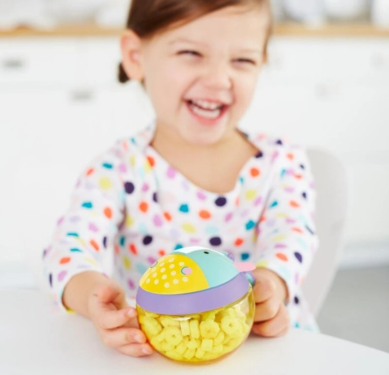 - An der Seite befindet sich ein praktischer Griff in Kindergröße, mit dem der Behälter auch an einem Kinderwagen oder einer Tasche befestigt werden kann.