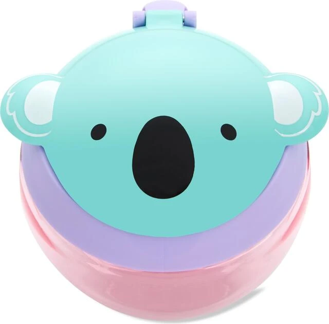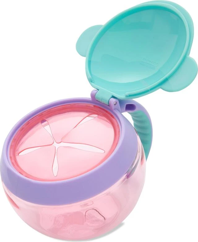 Eine praktische Idee für unterwegs. Der Behälter hat einen Deckel, der ihn beim Öffnen gegen das Entleeren des Inhalts durch flexible Lamellen hält, die die Kinderhand hineinlassen, aber die zehnte nicht herauslassen.