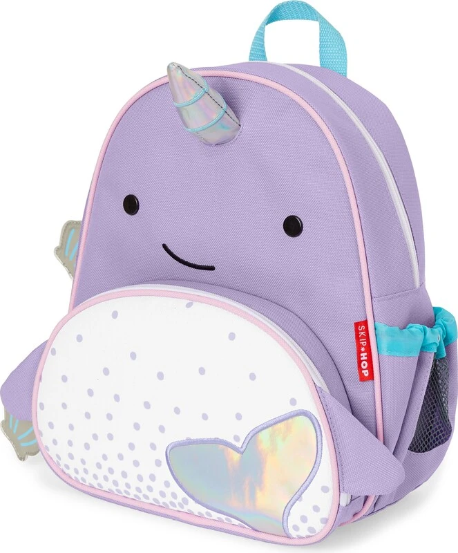 Schöner Rucksack mit Narwalmotiv. Der Rucksack verfügt über eine separate Vordertasche, ideal für zehn Personen, mit einer zusätzlichen Tasche für Buntstifte oder andere kleine Gegenstände. An der Seite befindet sich ein geräumiger Netzbeutel zum Trinken. Raffinierte Rucksackdetails passen zu den fröhlichen Reißverschlussmotiven.